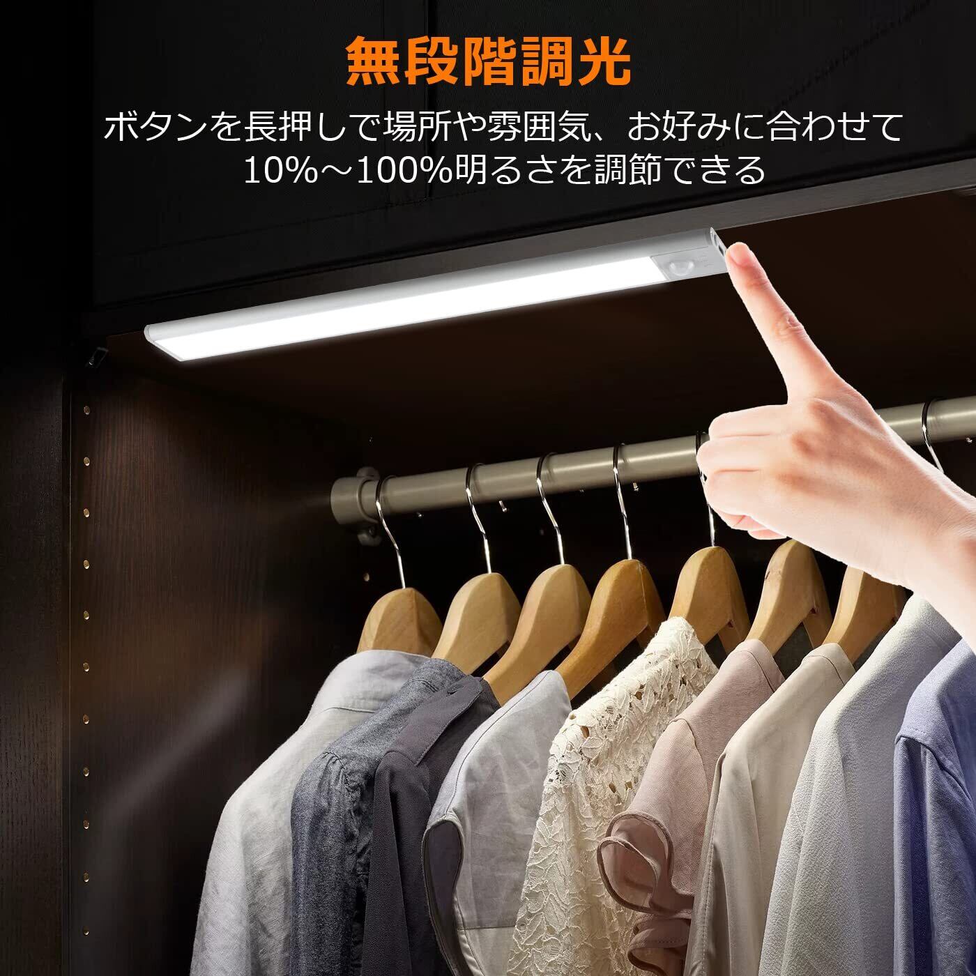 【3色調節可能・無段階調光・目に優しい】 従来単色ledセンサーライトに比べて、場所に合わせて昼光色/昼白色/電球色3色からお選びいただけます。それで、10%~100%の照明輝度を調整して、目に優しくて、周りの人に迷惑をかけたりしない無段階調光できます。クローゼットに設置すると、就寝中の人に邪魔にならなくて、隅までしっかり照らす事ができます。廊下や階段に設置すると、足元灯として、ご年配の方やお子様はお手洗いなども快適です。